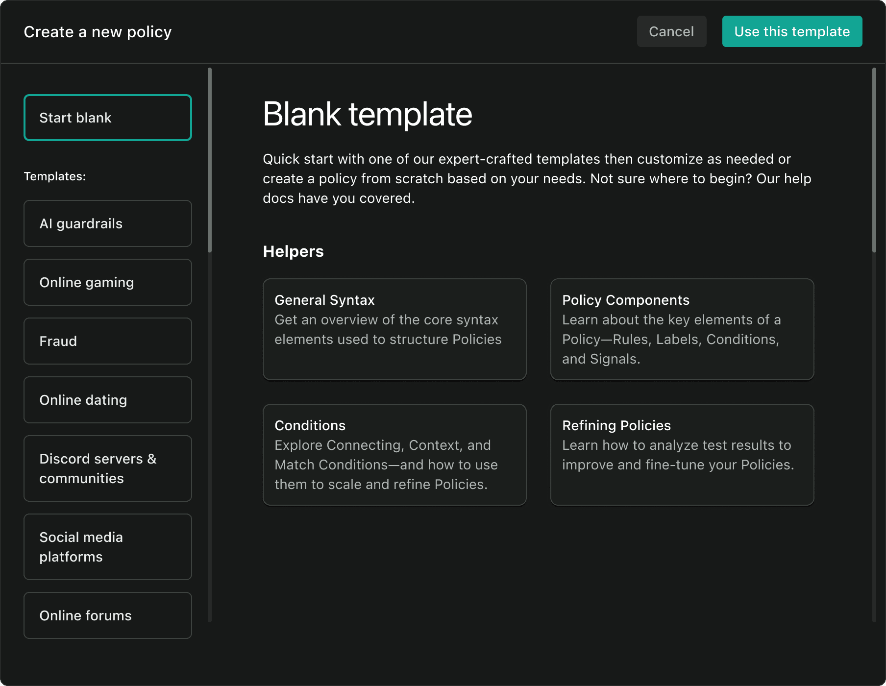 Ditch the guesswork of lengthy natural language prompts. Our topic-based policies use a simple structured syntax for precision and clarity.