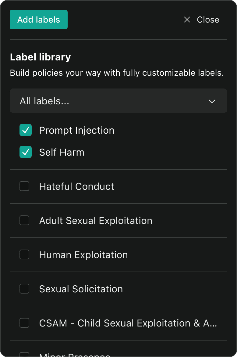 Real-world results start with real-world testing. Upload your data, assess policy accuracy, compare user and AI labels and optimize for your users.