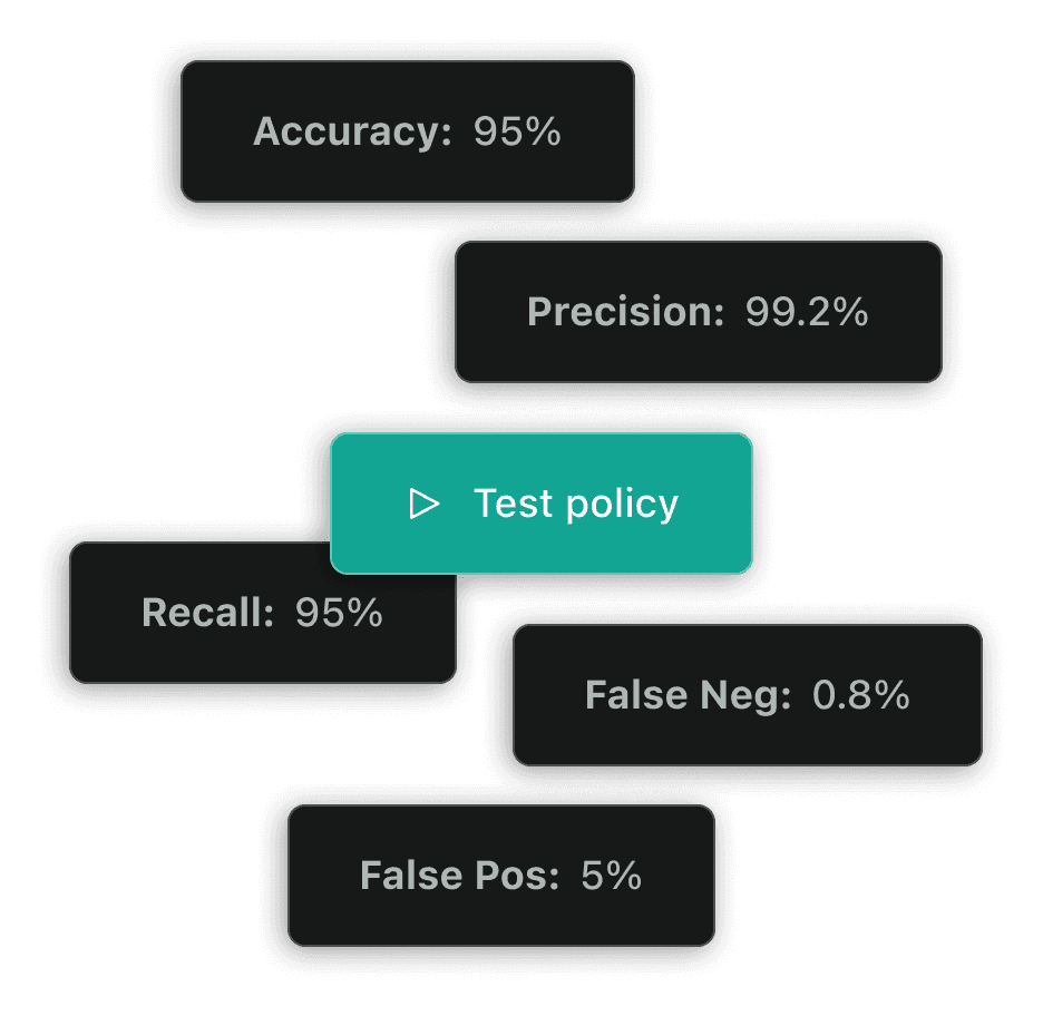 Know your policies work before launch. Fine-tune accuracy, precision, and recall, and verify performance using your real-world content.